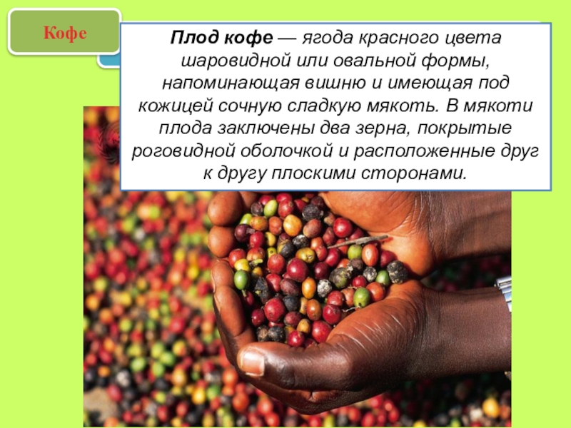 Плод кофе — ягода красного цвета шаровидной или овальной формы, напоминающая