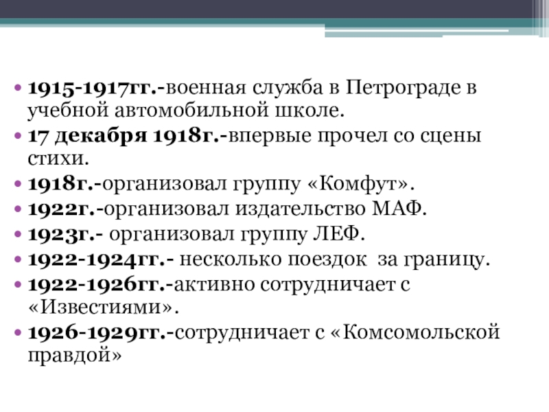 1915-1917гг.-военная служба в Петрограде в учебной автомобильной школе.17 декабря 1918г.-впервые прочел со сцены стихи.1918г.-организовал группу «Комфут».1922г.-организовал издательство