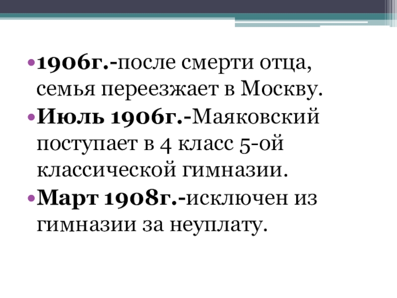 1906г.-после смерти отца, семья переезжает в Москву.Июль 1906г.-Маяковский поступает в 4 класс 5-ой классической гимназии.Март 1908г.-исключен из