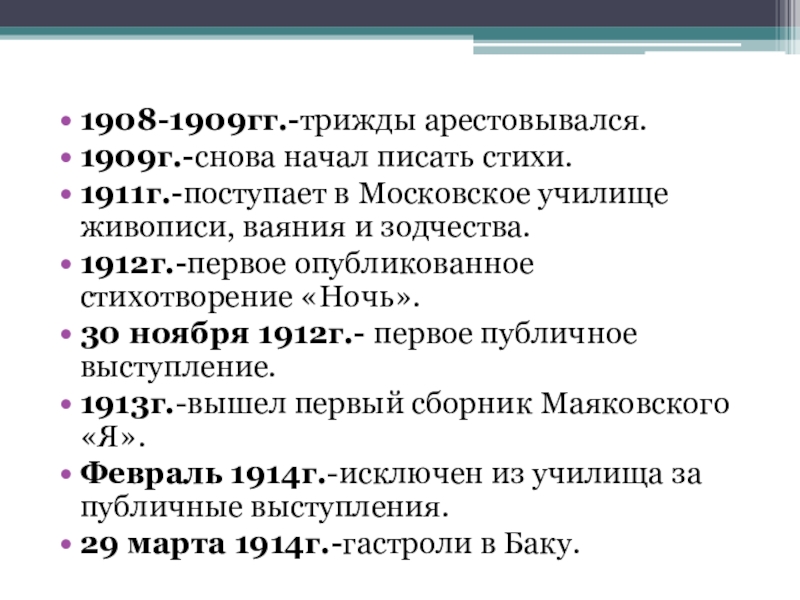 1908-1909гг.-трижды арестовывался.1909г.-снова начал писать стихи.1911г.-поступает в Московское училище живописи, ваяния и зодчества.1912г.-первое опубликованное стихотворение «Ночь».30 ноября 1912г.-