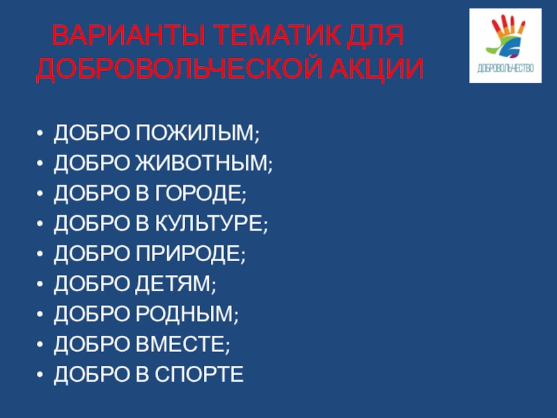 Слайд 26ВАРИАНТЫ ТЕМАТИК ДЛЯ ДОБРОВОЛЬЧЕСКОЙ АКЦИИ