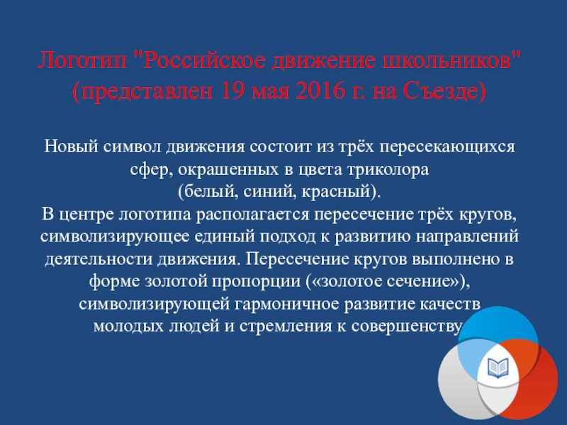 В центре логотипа располагается пересечение трёх кругов, символизирующее единый подход к развитию направлений деятельности движения. Пересечение кругов выполнено в форме золотой пропорции («золотое сечение»), символизирующей гармоничное развитие качеств
