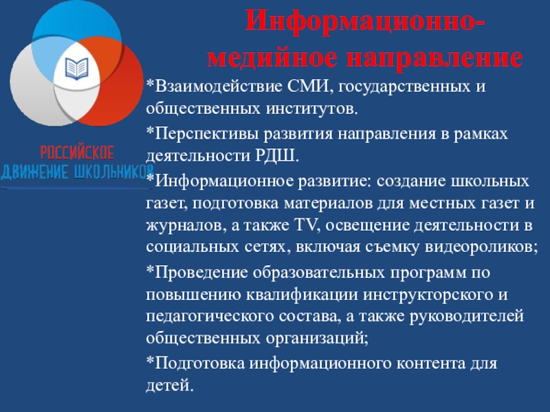 *Информационное развитие: создание школьных газет, подготовка материалов для местных газет и журналов, а также TV, освещение деятельности в социальных сетях, включая съемку видеороликов;