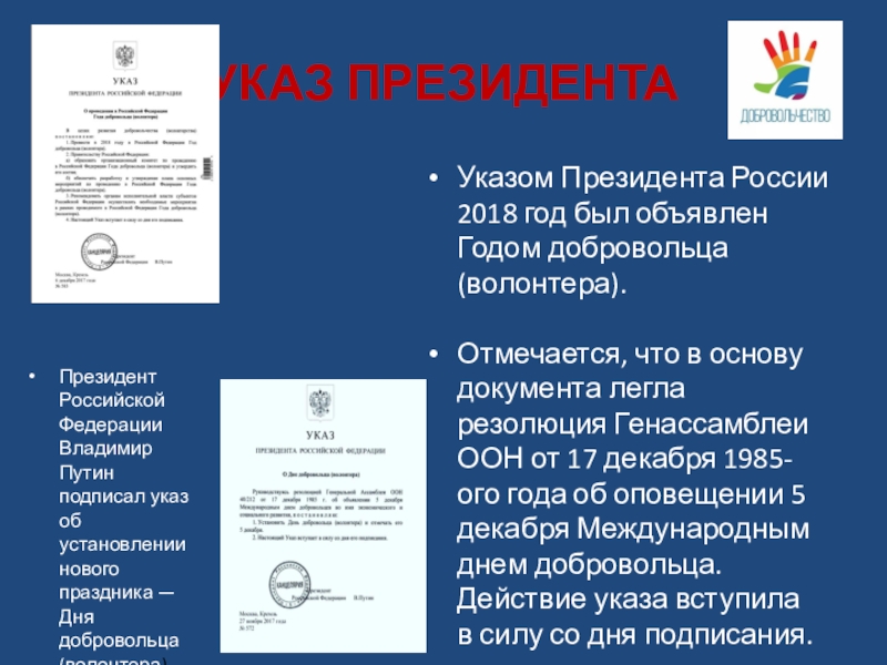 что в основу документа легла резолюция Генассамблеи ООН от 17 декабря 1985-ого года об оповещении 5 декабря Международным днем добровольца. Действие указа вступила в силу со дня подписания.
