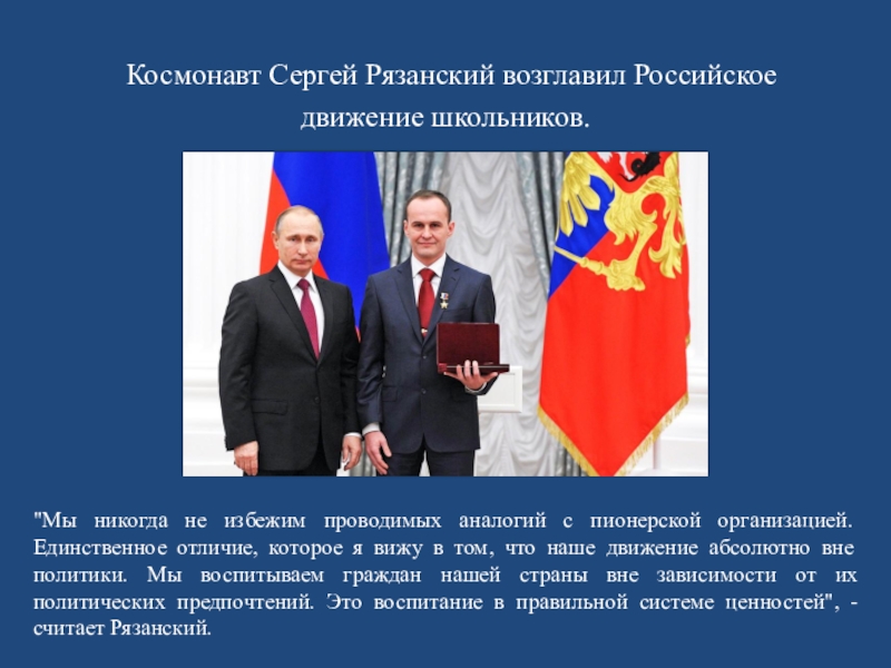 Слайд 5 Космонавт Сергей Рязанский возглавил Российское движение школьников.