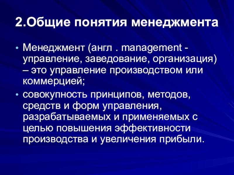 2.Общие понятия менеджментаМенеджмент (англ . management - управление, заведование, организация) – это управление производством или коммерцией; совокупность