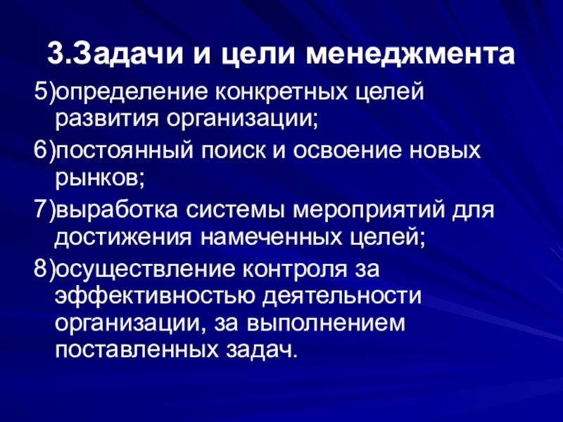 3.Задачи и цели менеджмента5)определение конкретных целей развития организации;6)постоянный поиск и освоение новых рынков;7)выработка системы мероприятий для достижения