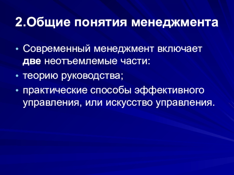 2.Общие понятия менеджментаСовременный менеджмент включает две неотъемлемые части:теорию руководства;практические способы эффективного управления, или искусство управления.