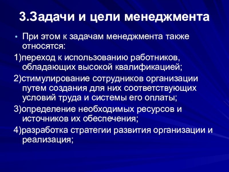 3.Задачи и цели менеджментаПри этом к задачам менеджмента также относятся:1)переход к использованию работников, обладающих высокой квалификацией;2)стимулирование сотрудников