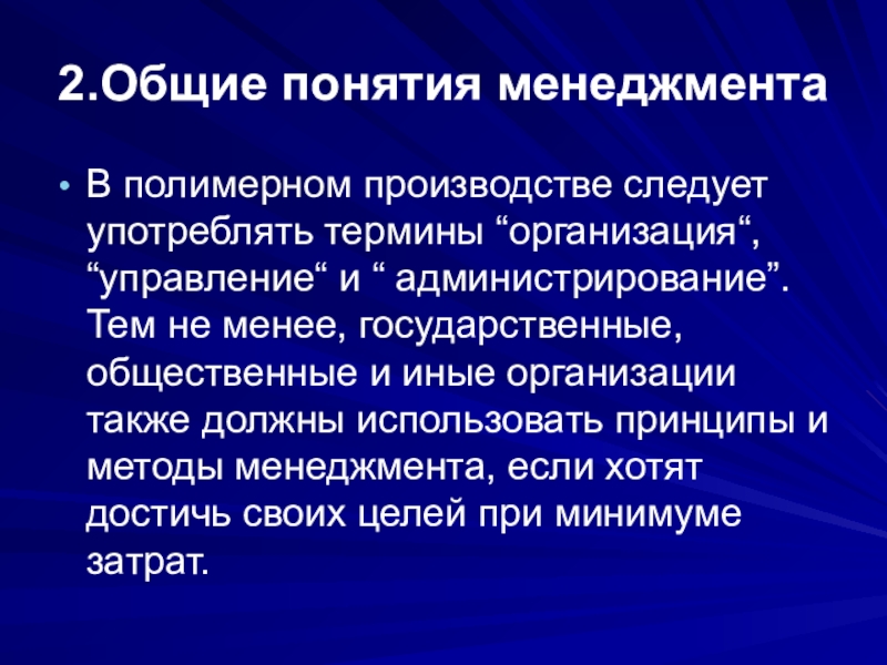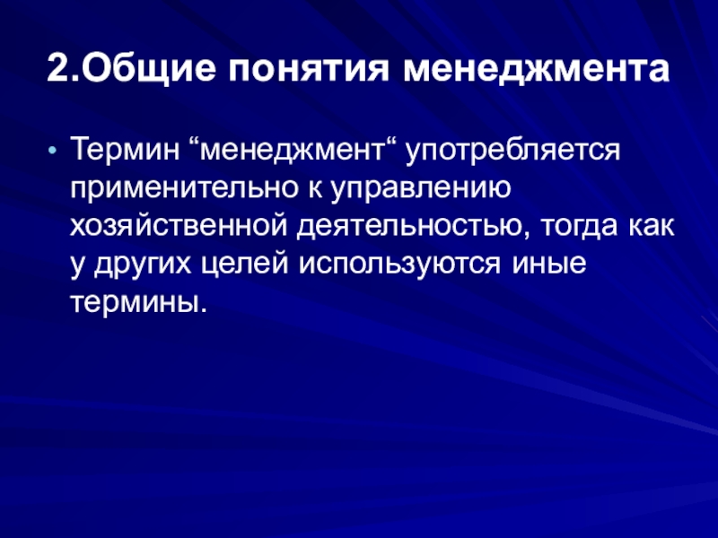 2.Общие понятия менеджментаТермин “менеджмент“ употребляется применительно к управлению хозяйственной деятельностью, тогда как у других целей используются иные