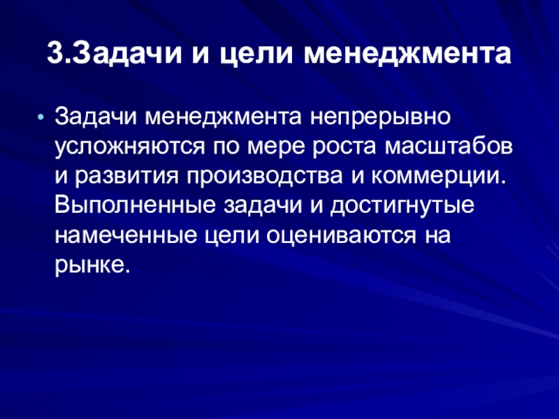 3.Задачи и цели менеджментаЗадачи менеджмента непрерывно усложняются по мере роста масштабов и развития производства и коммерции. Выполненные