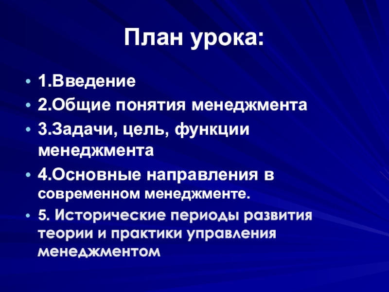 План урока:1.Введение2.Общие понятия менеджмента3.Задачи, цель, функции менеджмента4.Основные направления в современном менеджменте.5. Исторические периоды развития теории и практики управления менеджментом