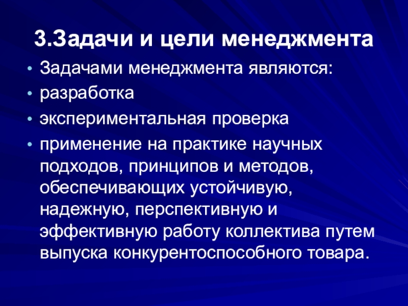 3.Задачи и цели менеджментаЗадачами менеджмента являются:разработкаэкспериментальная проверкаприменение на практике научных подходов, принципов и методов, обеспечивающих устойчивую, надежную,