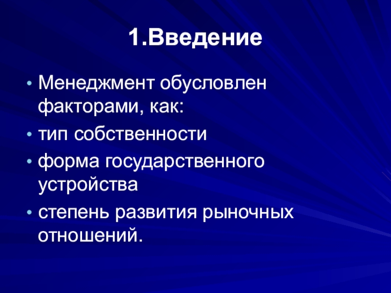 1.ВведениеМенеджмент обусловлен факторами, как: тип собственностиформа государственного устройствастепень развития рыночных отношений.
