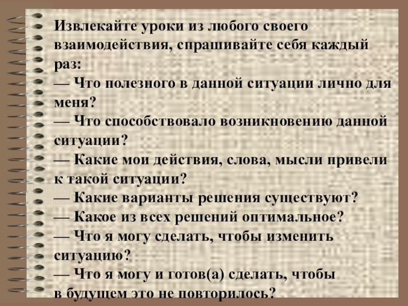 Слайд 21Извлекайте уроки из любого своего взаимодействия, спрашивайте себя каждый раз: