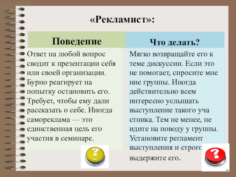 Бурно реагирует на попытку остановить его. Требует, чтобы ему дали рассказать о себе. Иногда самореклама — это единственная цель его участия в семинаре.