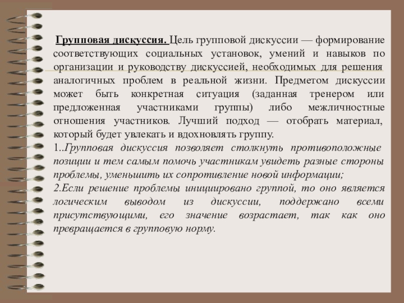1..Групповая дискуссия позволяет столкнуть противоположные позиции и тем самым помочь участникам увидеть разные стороны проблемы, уменьшить их сопротивление новой информации;