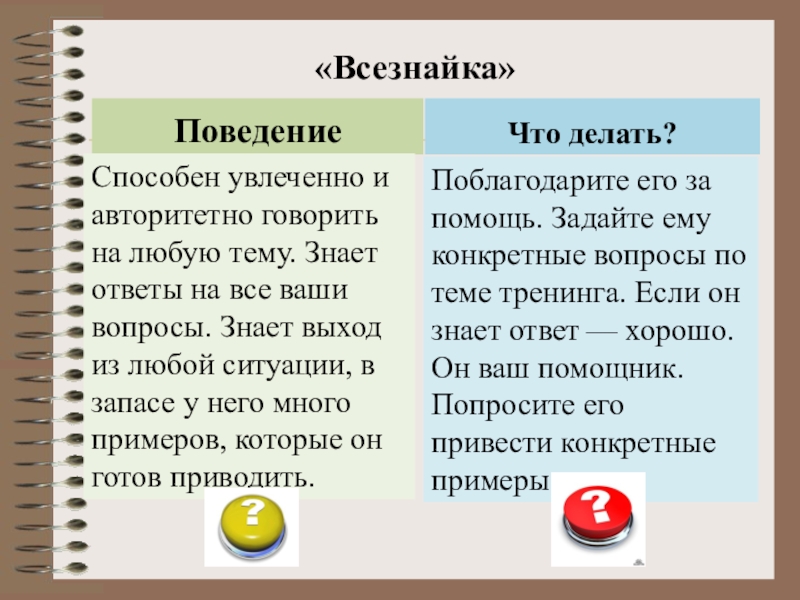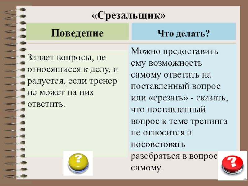 Можно предоставить ему возможность самому ответить на поставленный вопрос или «срезать» - сказать, что поставленный вопрос к теме тренинга не относится и посоветовать разобраться в вопросе самому.