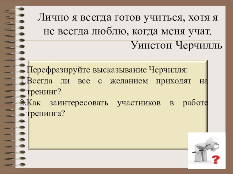Поблагодарите его за помощь. Задайте ему конкретные вопросы по теме тренинга. Если он знает ответ — хорошо. Он ваш помощник. Попросите его привести конкретные примеры
