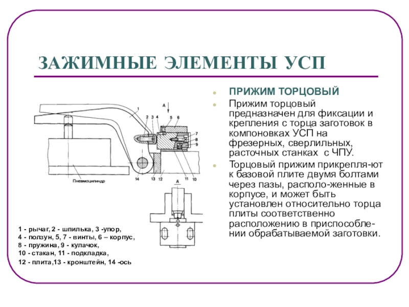 Торцовый прижим прикрепля-ют к базовой плите двумя болтами через пазы, располо-женные в корпусе, и может быть установлен относительно торца плиты соответственно расположению в приспособле-нии обрабатываемой заготовки.