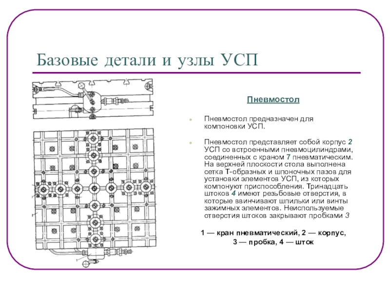 собой корпус 2 УСП со встроенными пневмоцилиндрами, соединенных с краном 7 пневматическим. На верхней плоскости стола выполнена сетка Т-образных и шпоночных пазов для установки элементов УСП, из которых компонуют приспособления. Тринадцать штоков 4 имеют резьбовые отверстия, в которые ввинчивают шпильки или винты зажимных элементов. Неиспользуемые отверстия штоков закрывают пробками 3