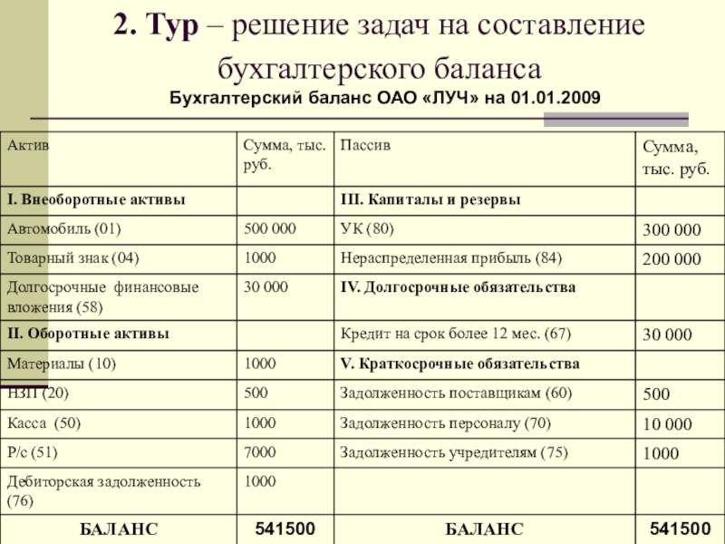 Слайд 162. Тур – решение задач на составление бухгалтерского баланса