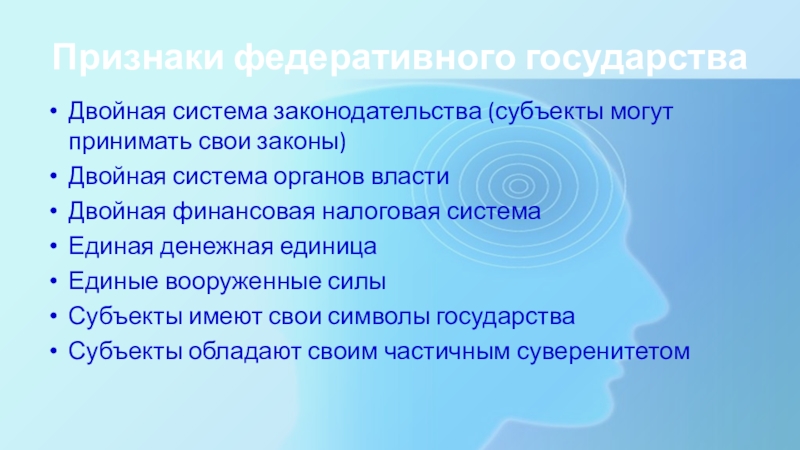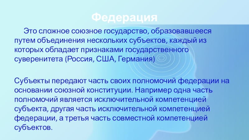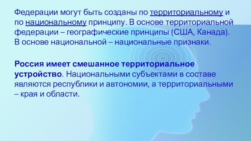 основе территориальной федерации – географические принципы (США, Канада). В основе национальной – национальные признаки.
