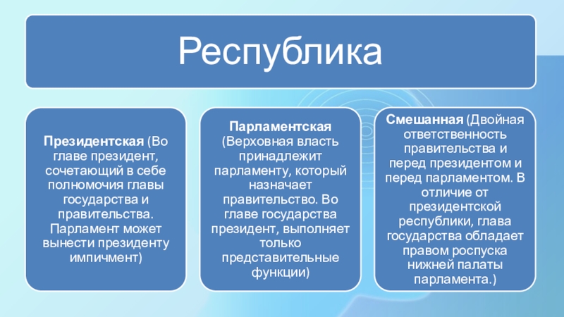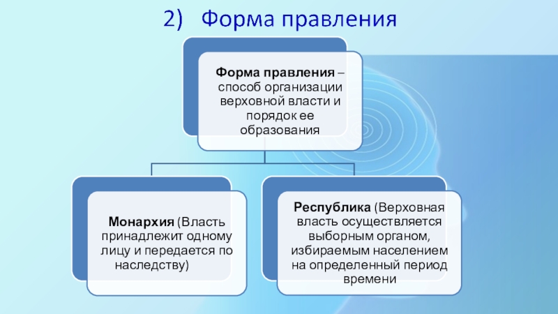 органов государственной власти, их взаимоотношения друг с другом и населением; в зависимости от особенностей формы правления государства подразделяются на монархические и республиканские);