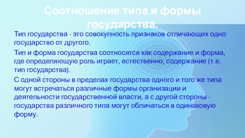 Тип и форма государства соотносятся как содержание и форма, где определяющую роль играет, естественно, содержание (т.е. тип государства).