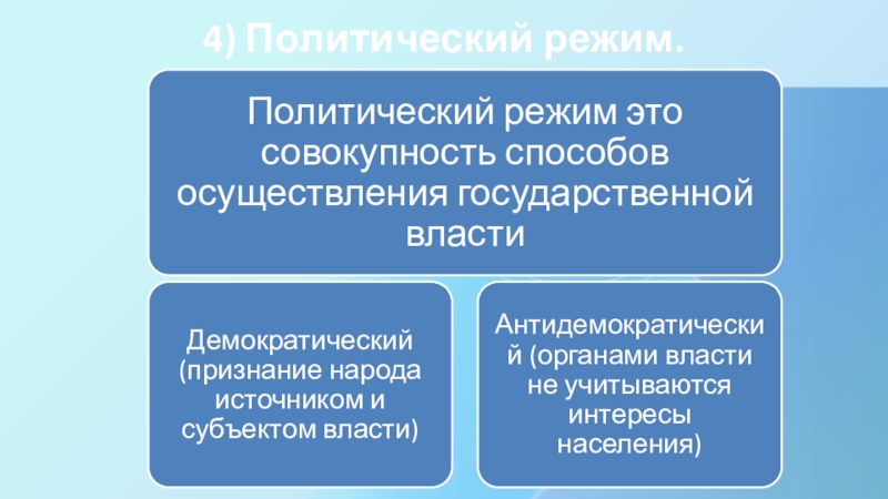 3) политический режим (представляет собой систему методов, способов и средств осуществления государственной власти; в зависимости от особенностей набора данных приемов государственного властвования различают демократический и антидемократический политические режимы).