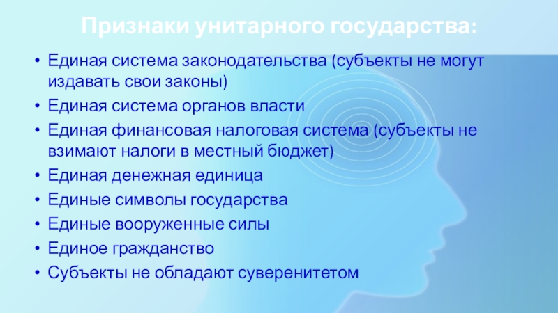 Это единое государство, не имеющее в своем составе субъектов, обладающих
