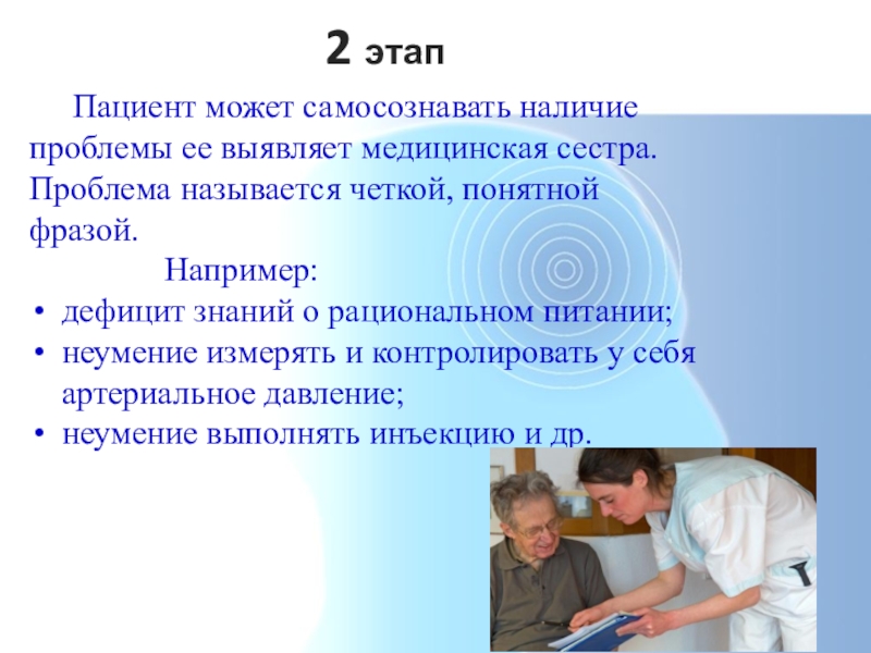 2 этап – интерпретация проблем пациента, связанных с дефицитом знаний и умений.