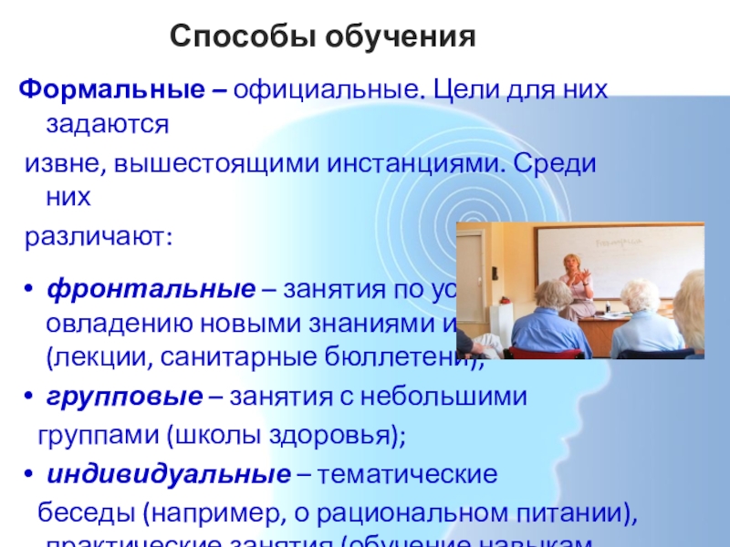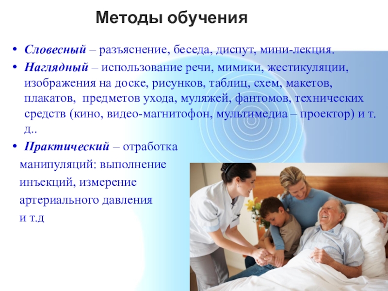 беседы (например, о рациональном питании), практические занятия (обучение навыкам самоухода, уходу за тяжелобольным, приему лекарственных препаратов и др.).