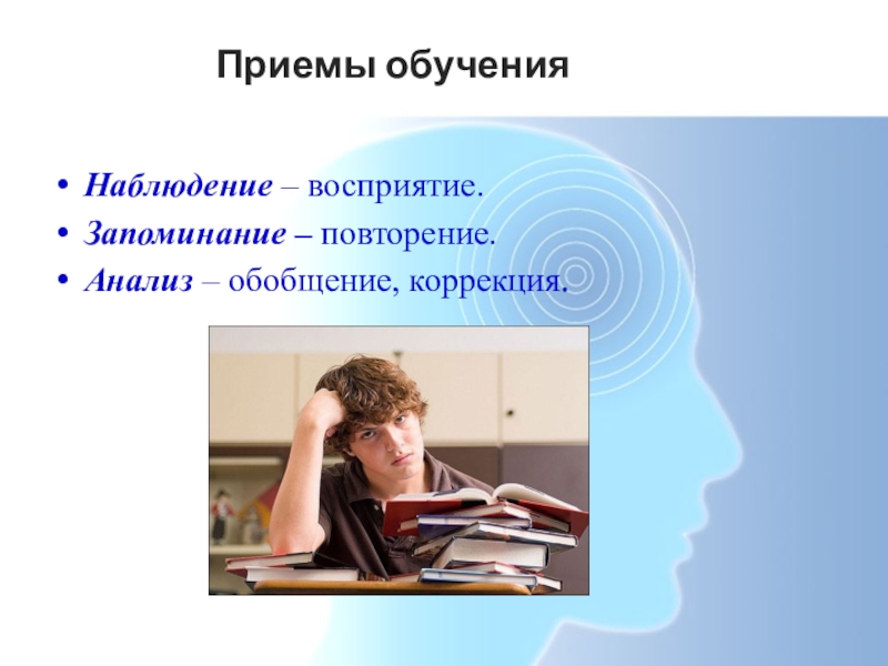 постоянный контроль приобретенных знаний, поощрение вопросов.