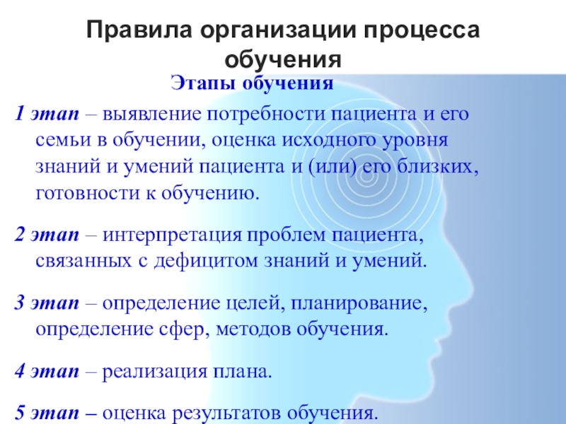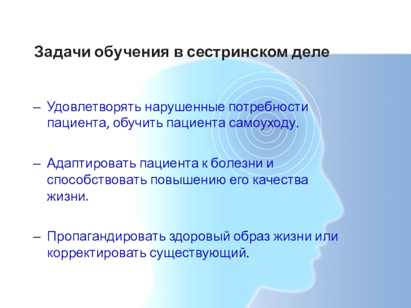 Обучение в сестринском деле – это целенаправленная деятельность медицинской сестры и пациента для получения знаний и формирования навыков у пациента.