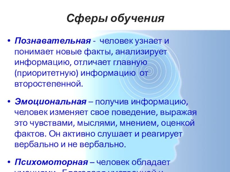 Психомоторная – человек обладает умениями. Благодаря умственной и мышечной деятельности, он обучился новым движениям, уверенно выполняет необходимые действия. Готов психологически, физически и эмоционально к выполнению действий.