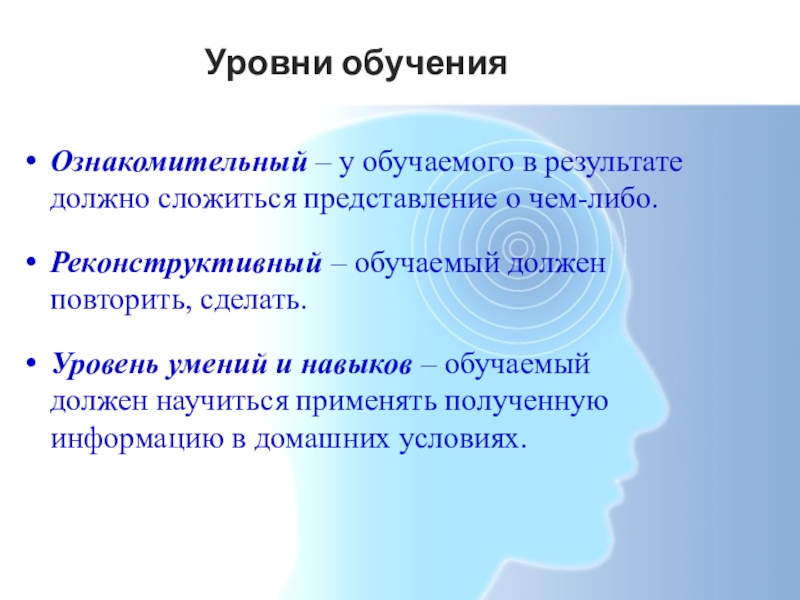 Уровень умений и навыков – обучаемый должен научиться применять полученную информацию в домашних условиях.
