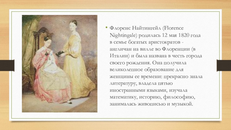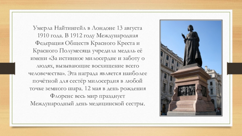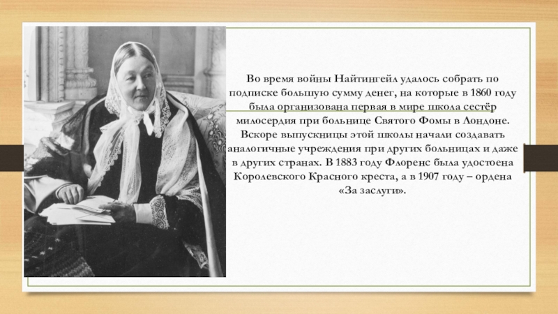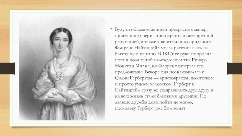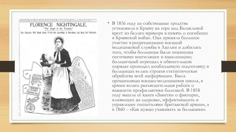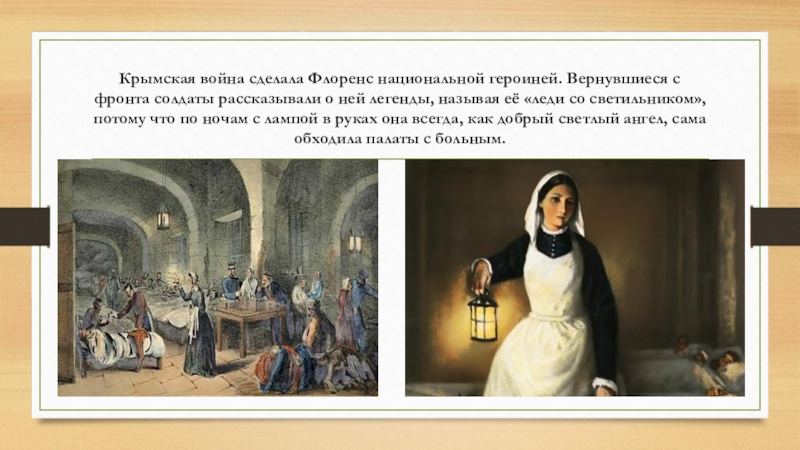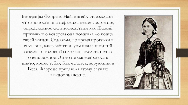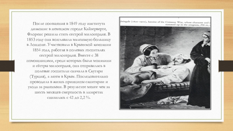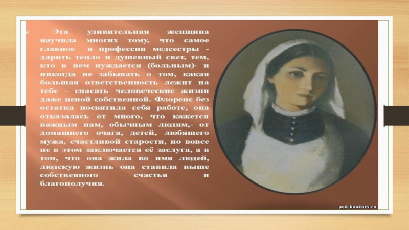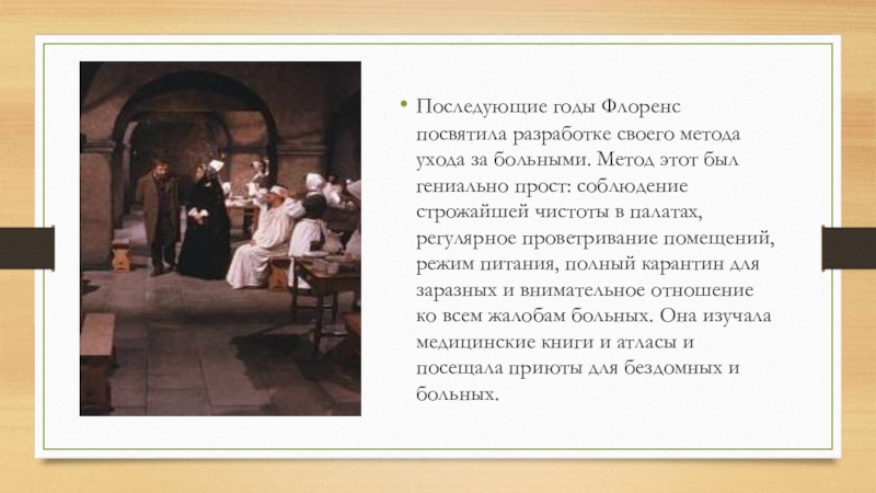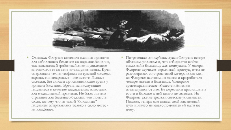 Потрясенная до глубины души Флоренс вскоре объявила родителям, что собирается пойти сиделкой в больницу для неимущих. У матери Флоренс случился сердечный приступ, отец не разговаривал со строптивой дочерью два дня, но Флоренс настояла на своем и проработала четыре недели в больнице. Чопорное аристократическое общество Лондона отшатнулось от нее. Ее перестали приглашать в гости и больше к ней никто не сватался. Но Флоренс уже не трогали светские условности. Похоже, теперь она нашла свой жизненный путь и ничто не могло помешать ей идти по нему.