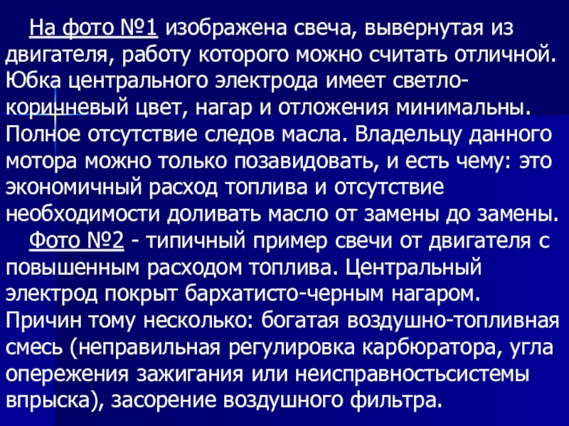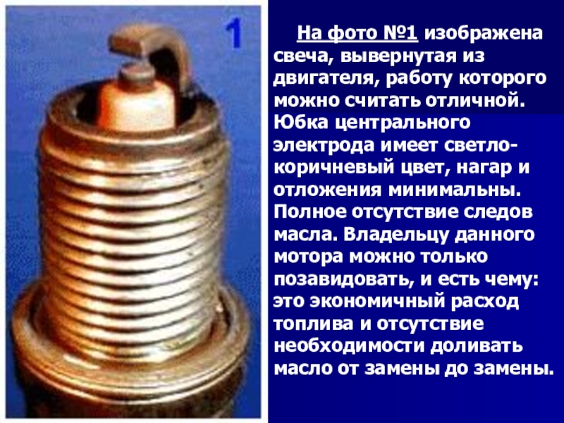 Слайд 25На фото №1 изображена свеча, вывернутая из двигателя, работу которого можно считать