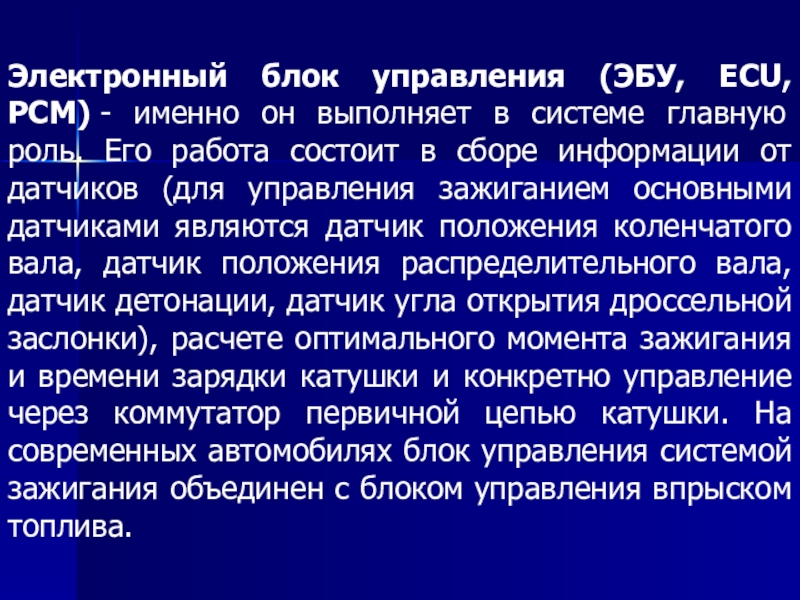 Слайд 59Электронный блок управления (ЭБУ, ECU, PCM) - именно он выполняет в системе
