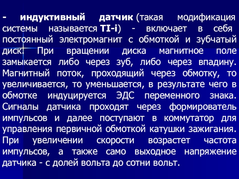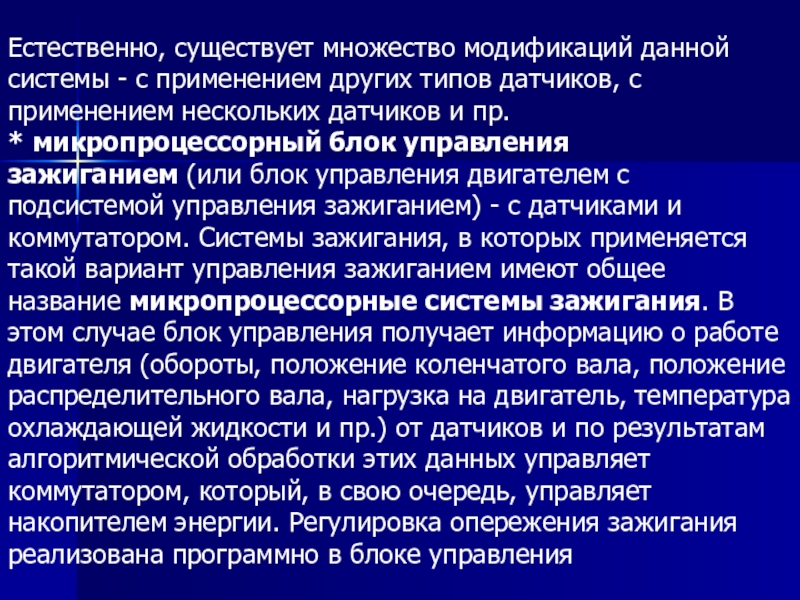 * микропроцессорный блок управления зажиганием (или блок управления двигателем с подсистемой управления зажиганием) - с датчиками и коммутатором. Системы зажигания, в которых применяется такой вариант управления зажиганием имеют общее название микропроцессорные системы зажигания. В этом случае блок управления получает информацию о работе двигателя (обороты, положение коленчатого вала, положение распределительного вала, нагрузка на двигатель, температура охлаждающей жидкости и пр.) от датчиков и по результатам алгоритмической обработки этих данных управляет коммутатором, который, в свою очередь, управляет накопителем энергии. Регулировка опережения зажигания реализована программно в блоке управления
