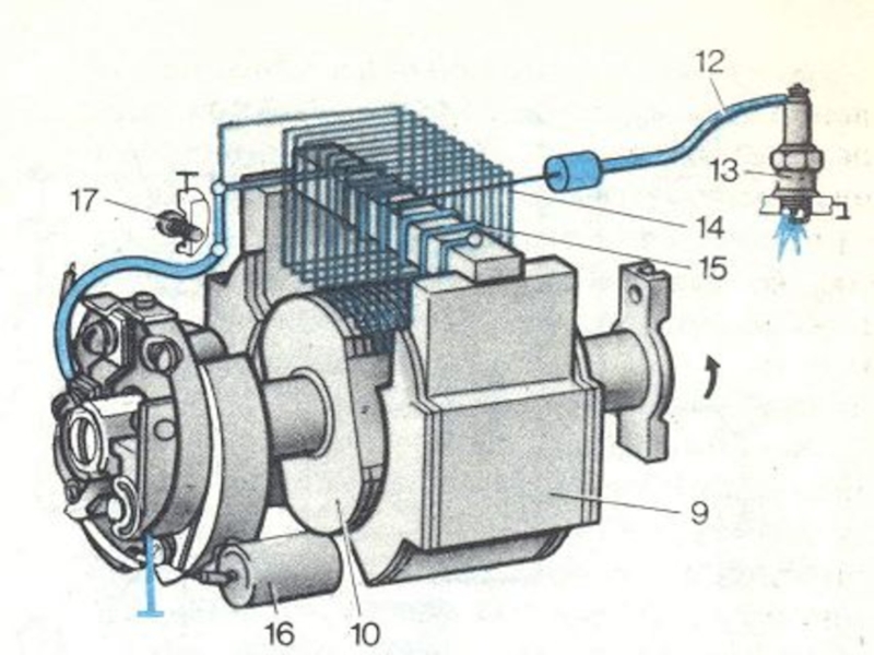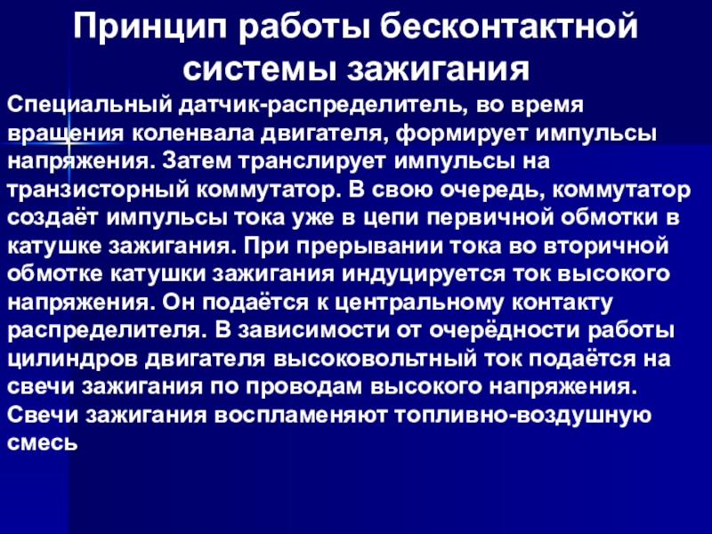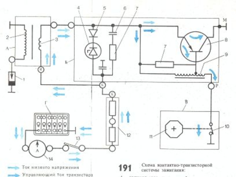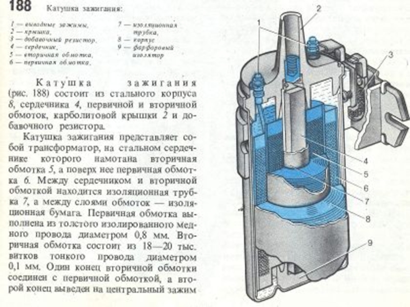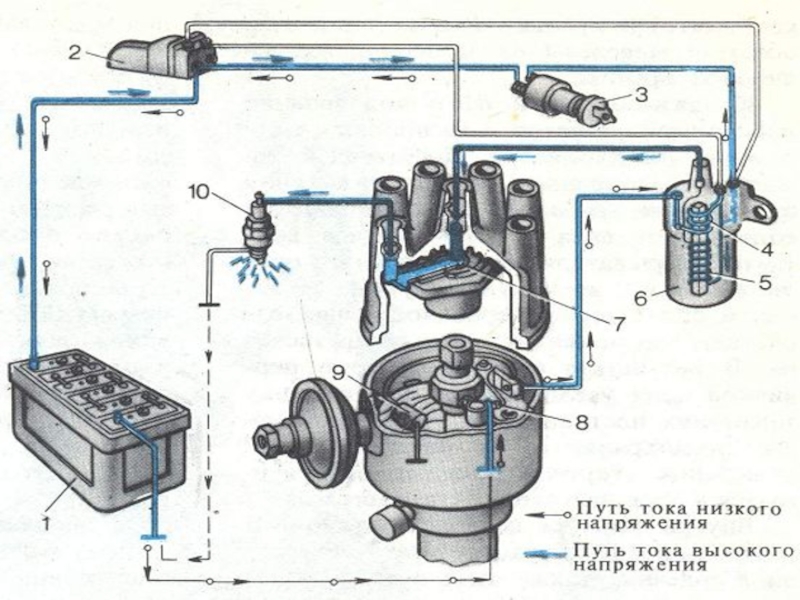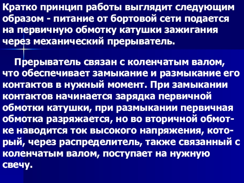 Кратко принцип работы выглядит следующим образом - питание от бортовой сети подается на первичную обмотку катушки зажигания через механический прерыватель.