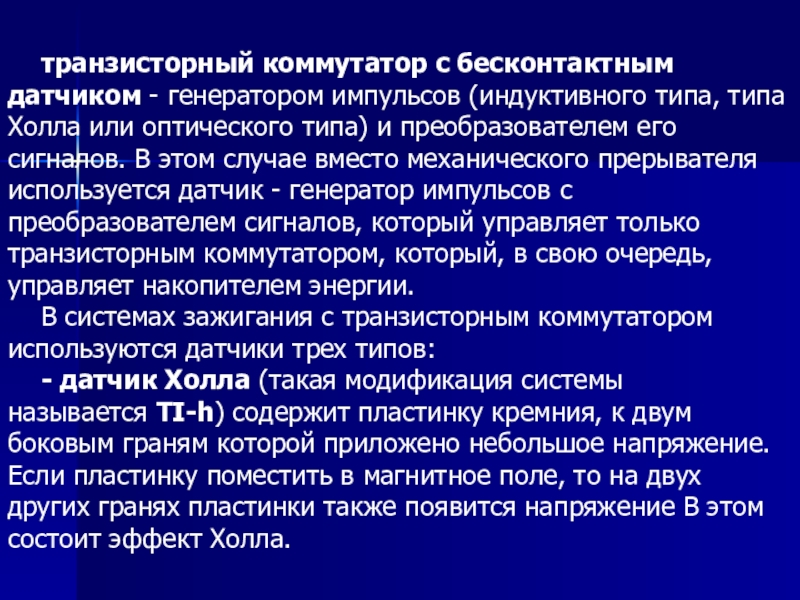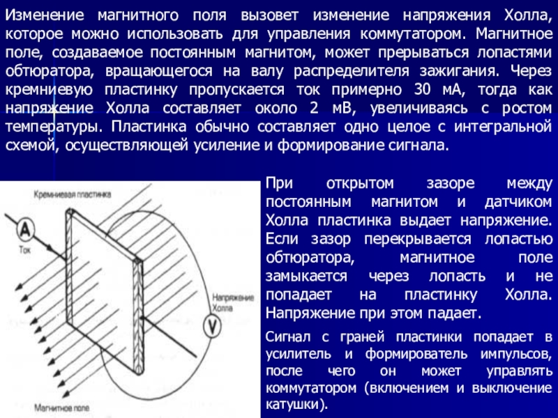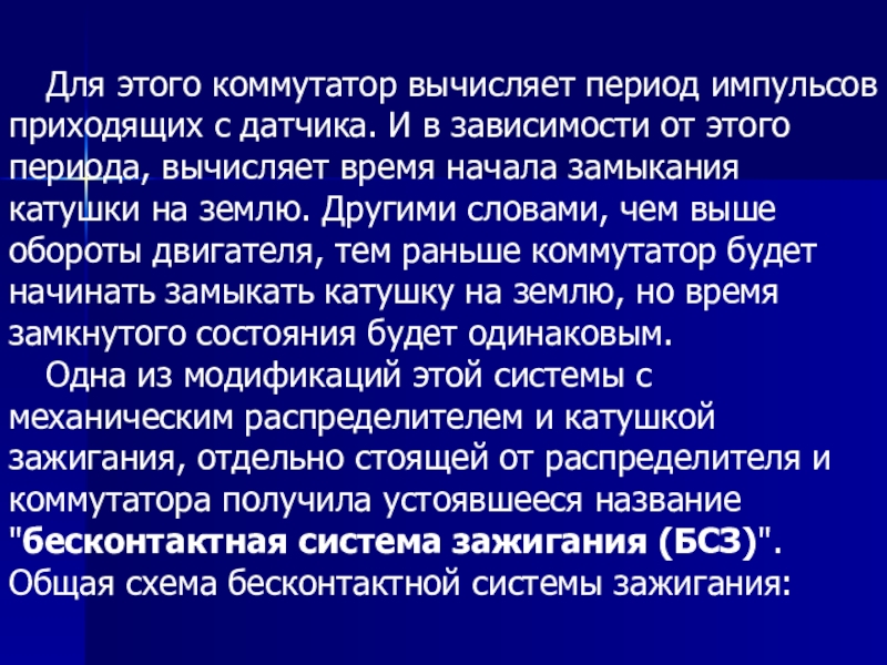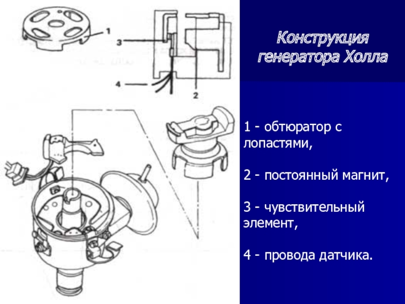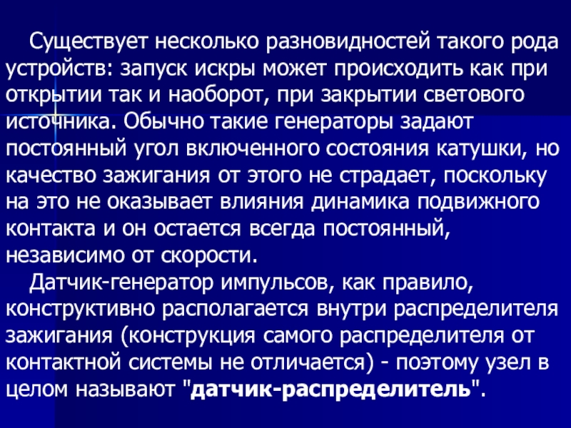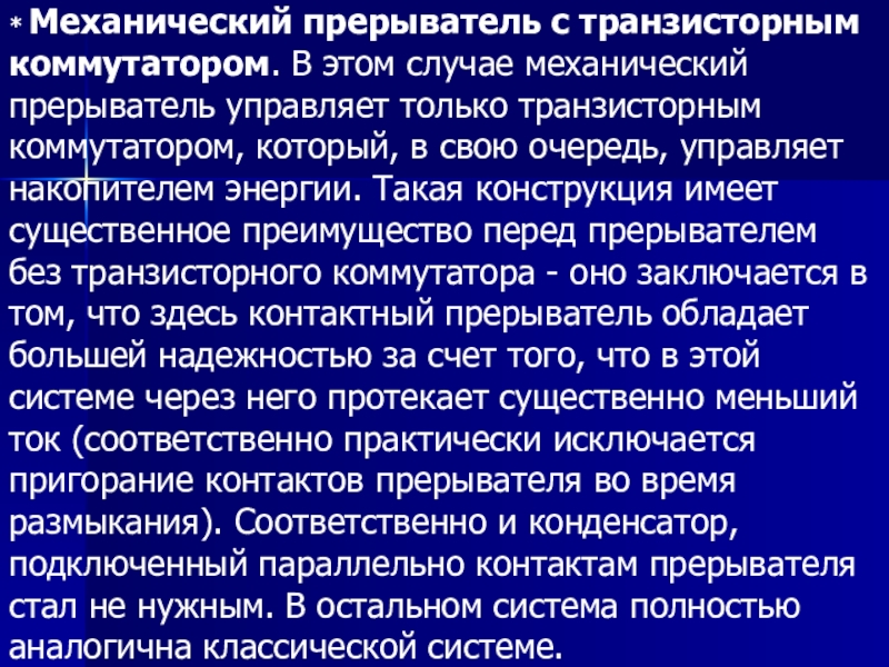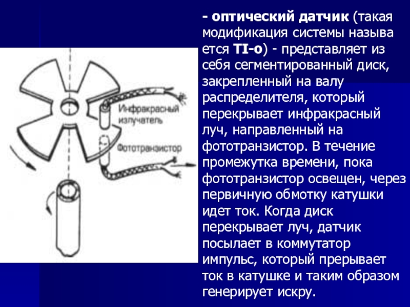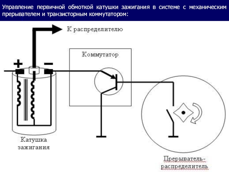 Слайд 4 Прерыватель связан с коленчатым валом, что обеспечивает замыкание и размыкание