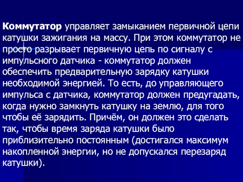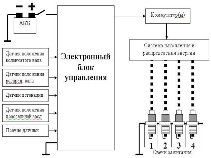 главную роль. Его работа состоит в сборе информации от датчиков (для управления зажиганием основными датчиками являются датчик положения коленчатого вала, датчик положения распределительного вала, датчик детонации, датчик угла открытия дроссельной заслонки), расчете оптимального момента зажигания и времени зарядки катушки и конкретно управление через коммутатор первичной цепью катушки. На современных автомобилях блок управления системой зажигания объединен с блоком управления впрыском топлива.