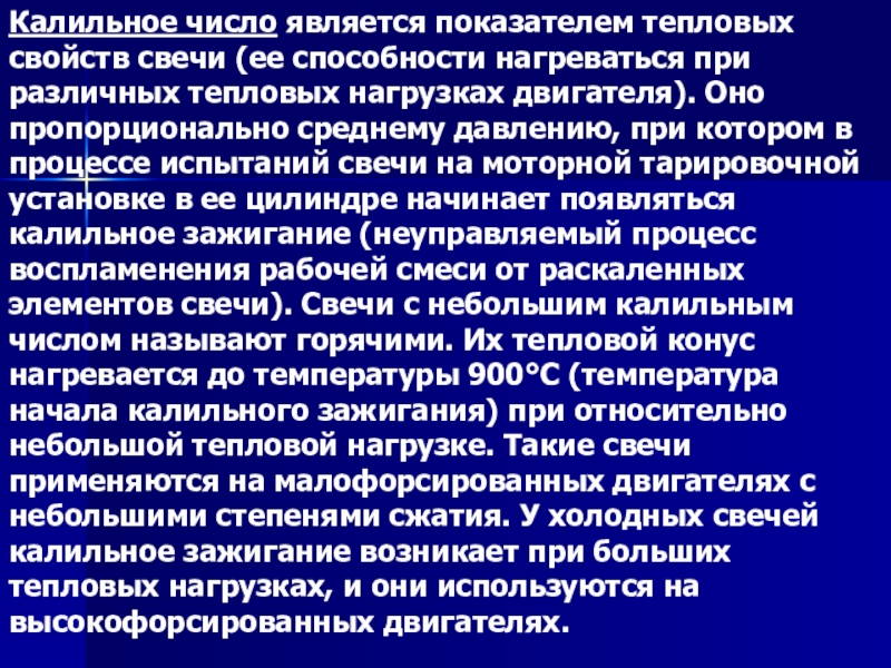тепловых нагрузках двигателя). Оно пропорционально среднему давлению, при котором в процессе испытаний свечи на моторной тарировочной установке в ее цилиндре начинает появляться калильное зажигание (неуправляемый процесс воспламенения рабочей смеси от раскаленных элементов свечи). Свечи с небольшим калильным числом называют горячими. Их тепловой конус нагревается до температуры 900°С (температура начала калильного зажигания) при относительно небольшой тепловой нагрузке. Такие свечи применяются на малофорсированных двигателях с небольшими степенями сжатия. У холодных свечей калильное зажигание возникает при больших тепловых нагрузках, и они используются на высокофорсированных двигателях.