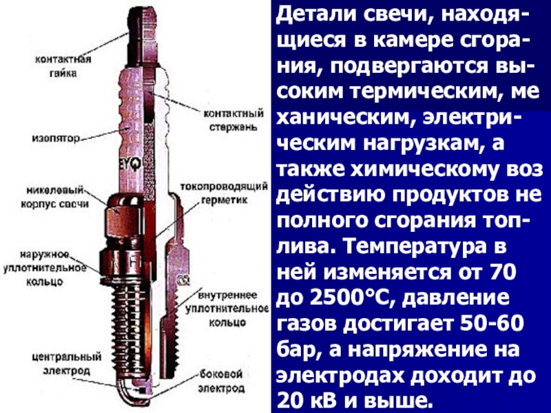 Слайд 17Детали свечи, находя- щиеся в камере сгора- ния, подвергаются вы- соким