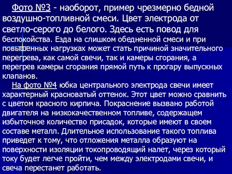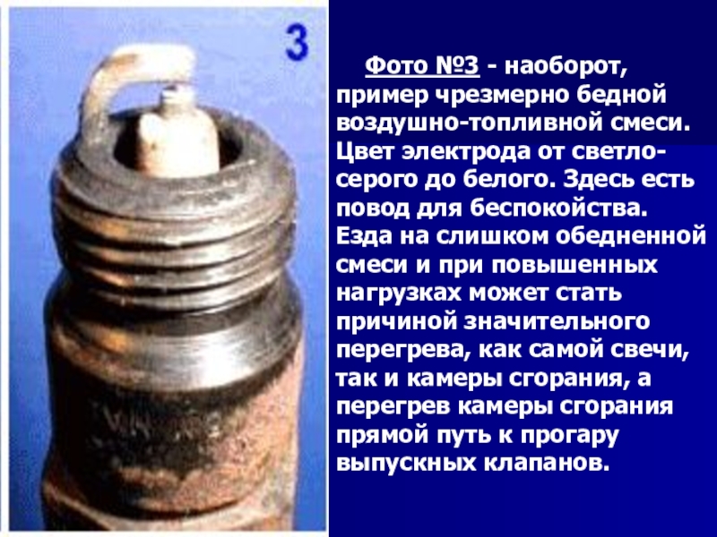 Слайд 27Фото №3 - наоборот, пример чрезмерно бедной воздушно-топливной смеси. Цвет электрода от