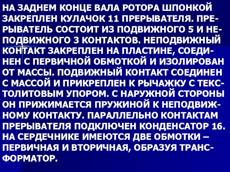 НА ЗАДНЕМ КОНЦЕ ВАЛА РОТОРА ШПОНКОЙ ЗАКРЕПЛЕН КУЛАЧОК 11 ПРЕРЫВАТЕЛЯ. ПРЕ-