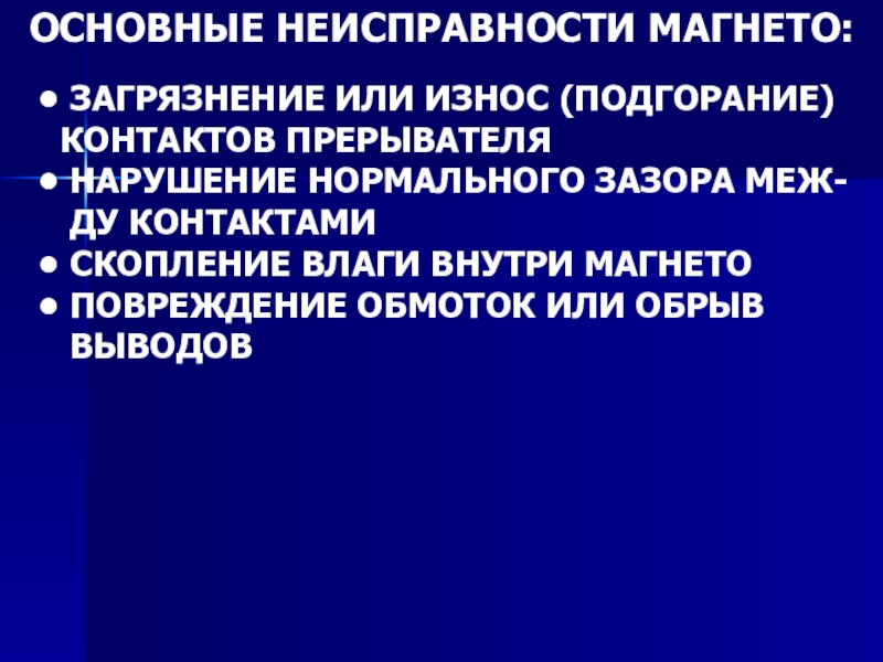 Слайд 72ОСНОВНЫЕ НЕИСПРАВНОСТИ МАГНЕТО:
