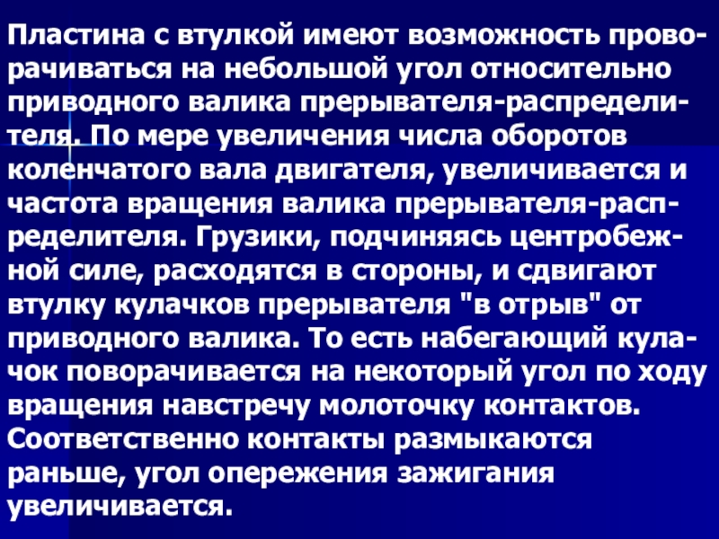 приводного валика прерывателя-распредели- теля. По мере увеличения числа оборотов коленчатого вала двигателя, увеличивается и частота вращения валика прерывателя-расп- ределителя. Грузики, подчиняясь центробеж- ной силе, расходятся в стороны, и сдвигают втулку кулачков прерывателя "в отрыв" от приводного валика. То есть набегающий кула- чок поворачивается на некоторый угол по ходу вращения навстречу молоточку контактов. Соответственно контакты размыкаются раньше, угол опережения зажигания увеличивается.